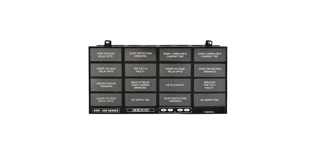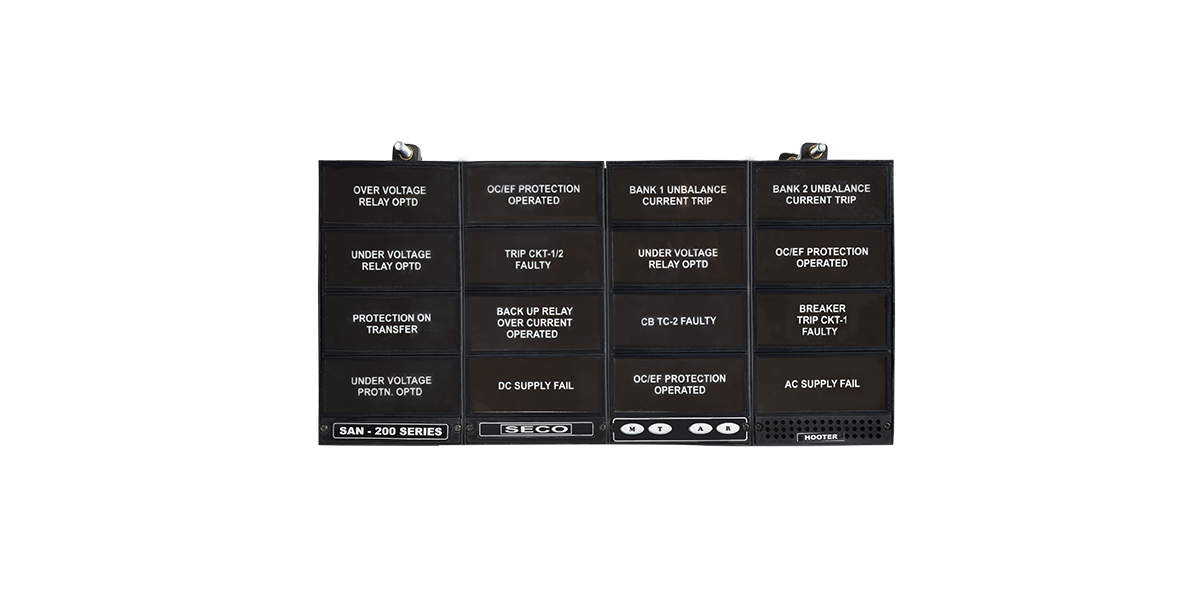We design & manufacture Microcontroller based Annunciator with inbuilt hooter (Speaker and other related circuits mounted inside the unit) from 2 windows to 64 windows with both Big window unit and small window unit & combination of Big & small window units in moulded box with Wide Aux. supply range, Standby working with AC supply, DC Fail Indication, Ac Fail Indication, RS 485 communication and Repeat relay contacts.